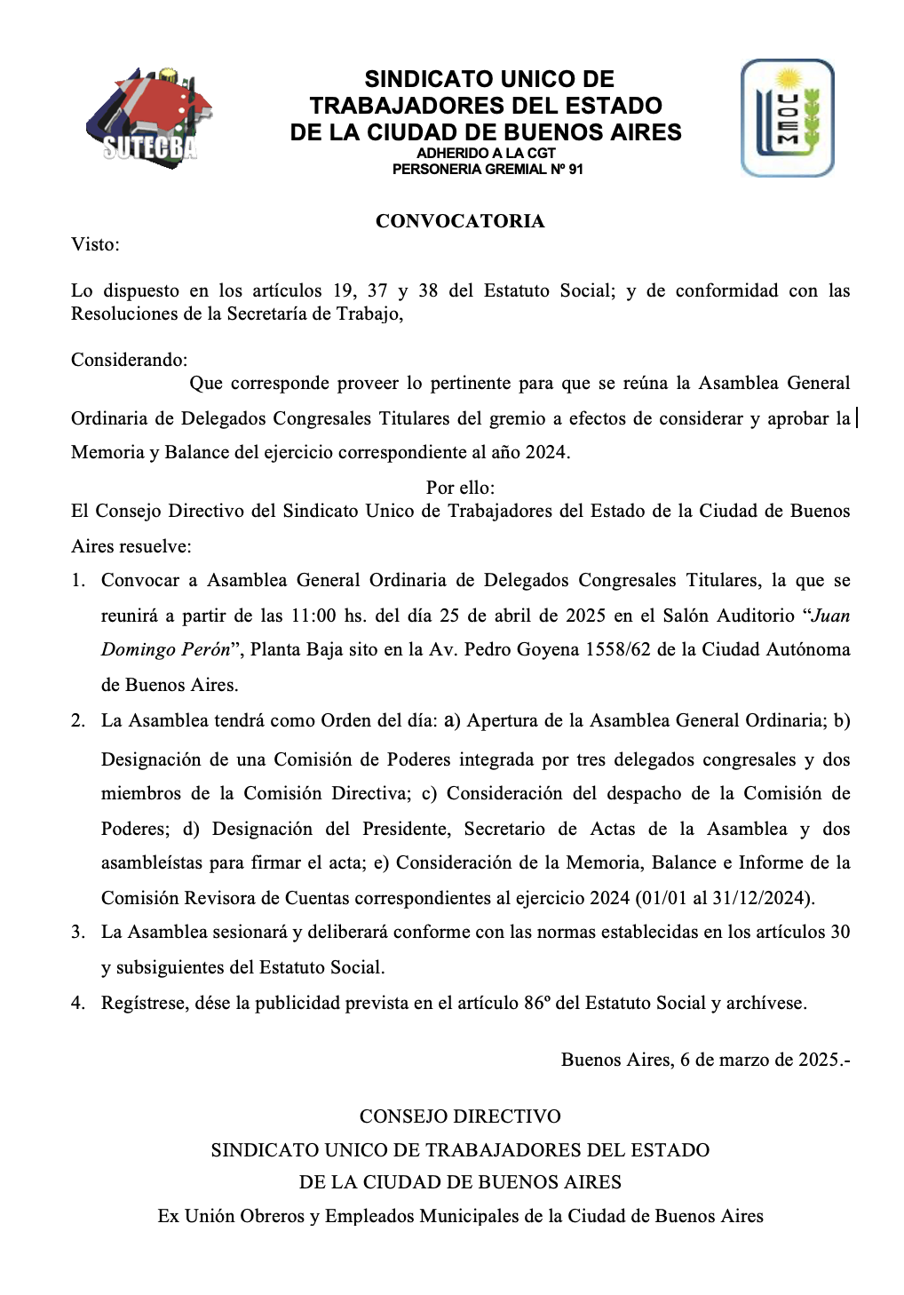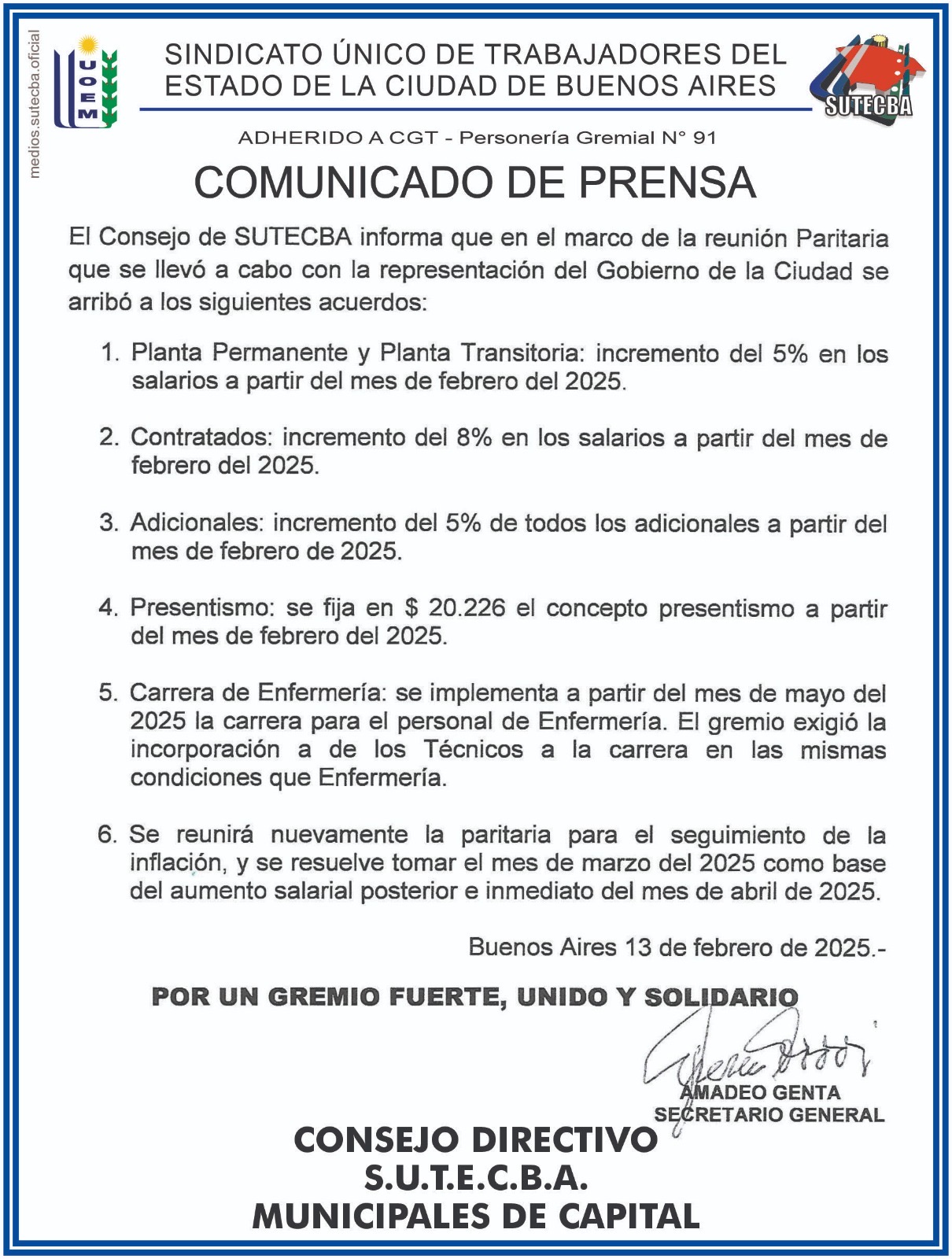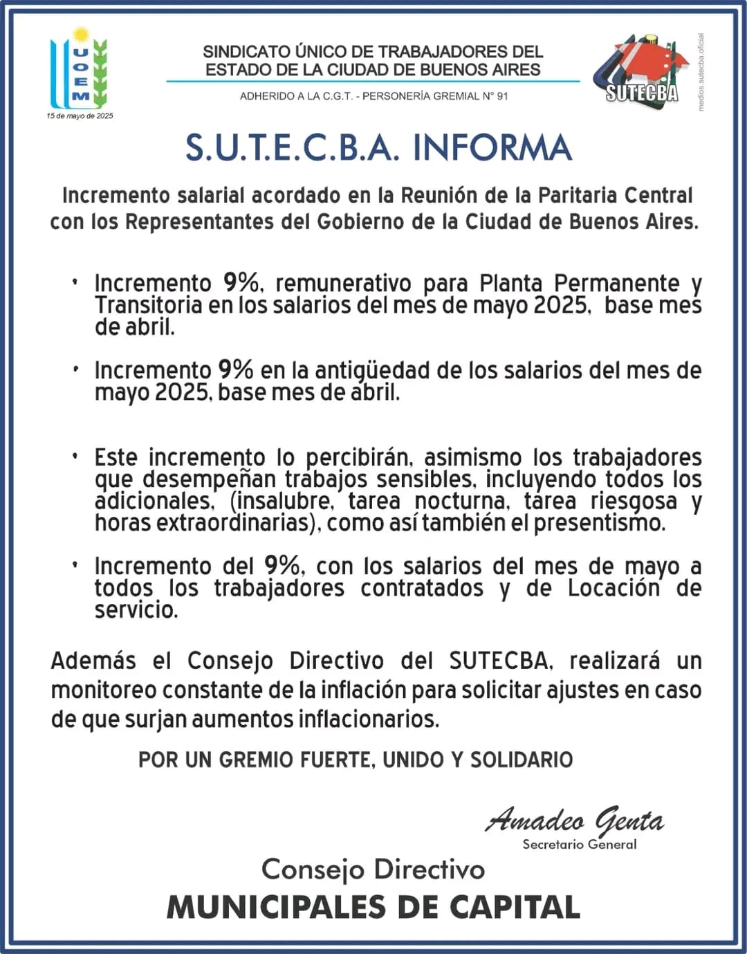 15 de mayo de 2025 SUTECBA INFORMA INCREMENTO SALARIAL